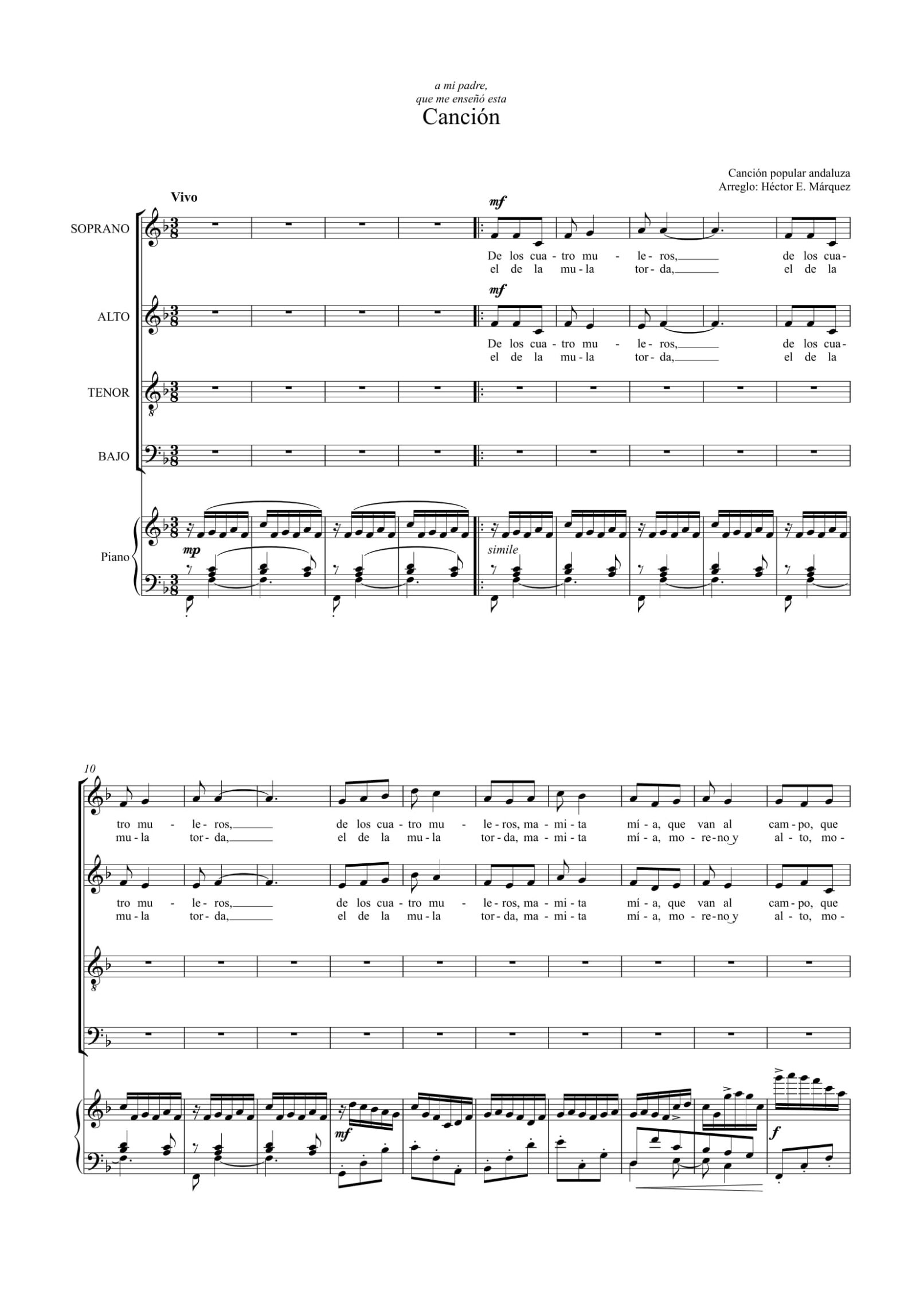 Quizá debería titular esta obra directamente “Los cuatro muleros”, una canción popular recogida por Federico García Lorca, pero al incluirla en mi cantata “La Madre” opté por este otro título, que me resultaba más sugerente en el contexto de las otras cuatro partes de la obra. Desde pequeño he cantado esta melodía, y considero este arreglo como mi mejor contribución a la música propia de mi tierra, entre otras cosas porque ayuda a entender el significado del texto, que suele pasar desapercibido para la mayoría.